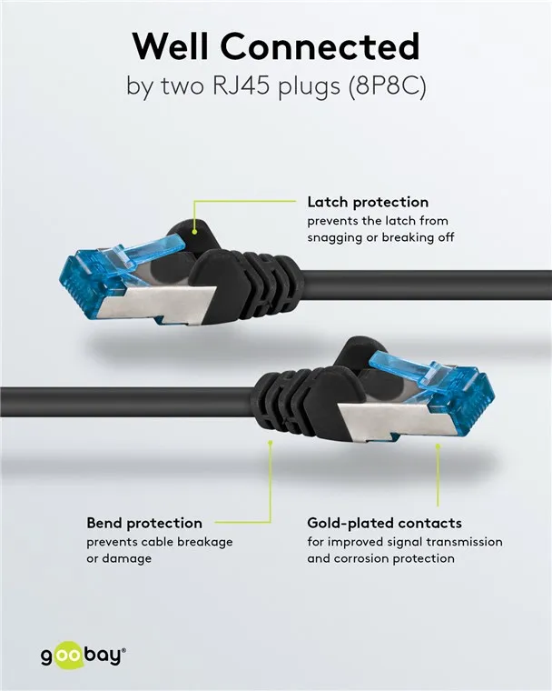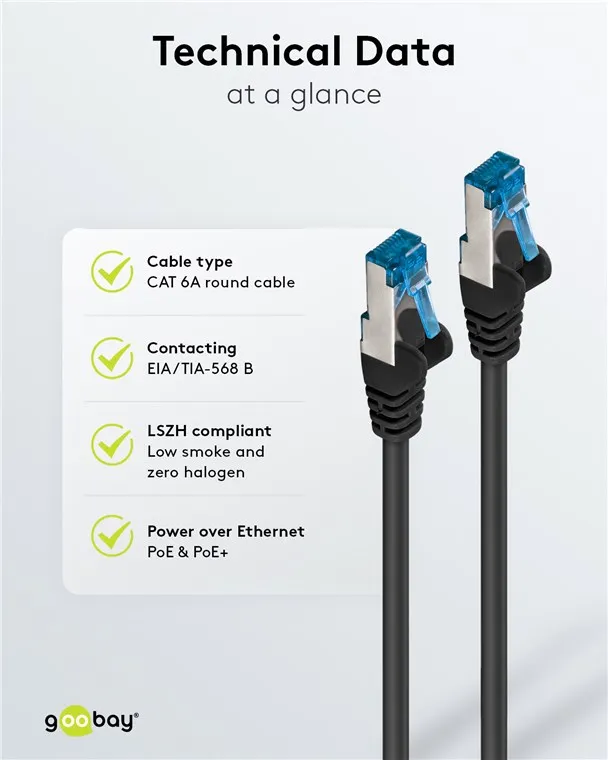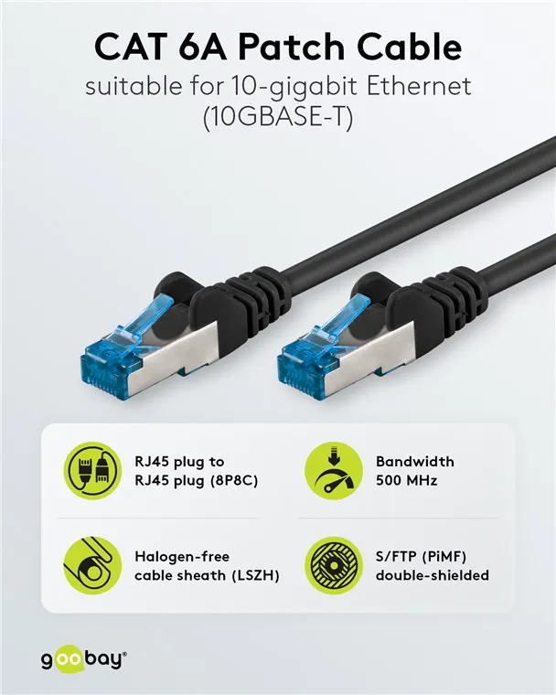 This high-quality Goobay Category 6A patch cord is engineered for high-performance networking, supporting data transfer speeds of up to 10 Gbps. It provides a reliable solution for building robust gigabit infrastructures in both professional and residential environments.