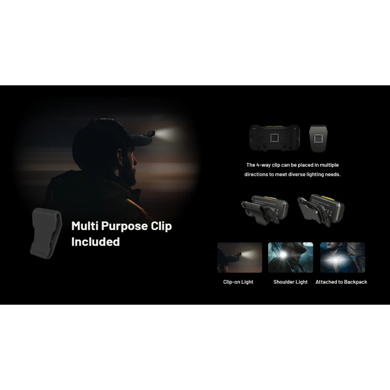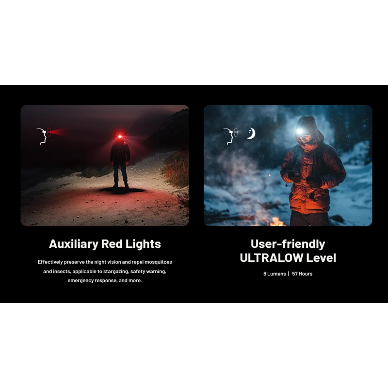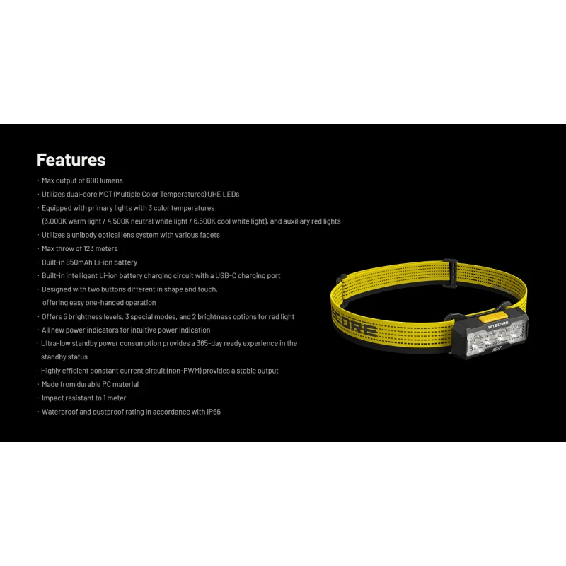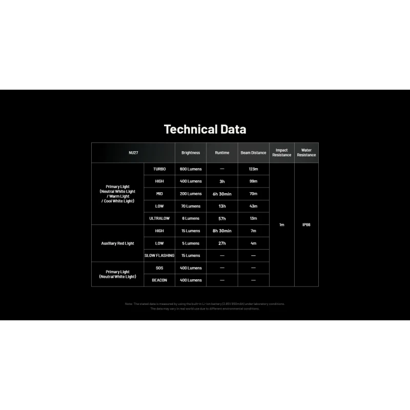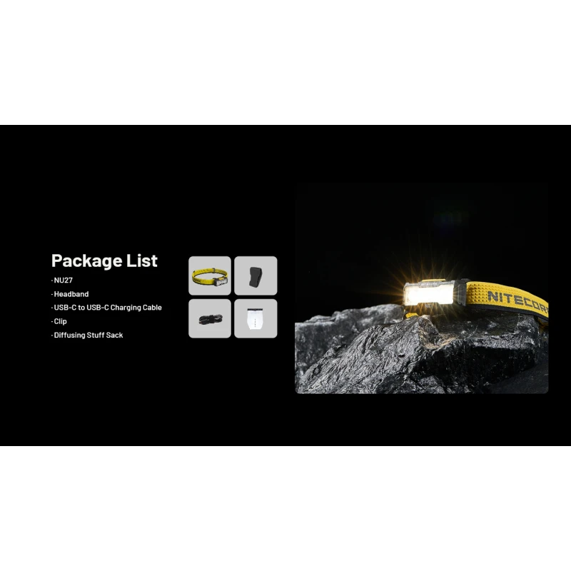 The NU27 is a lightweight headlamp with a built-in lithium-ion battery, delivering up to 600 lumens of brightness. Ideal for various daily situations requiring hands-free lighting. Offers up to 57 hours of runtime on the lowest mode. Equipped with 5 lighting modes, including SOS, beacon, and red light functions. The device can be charged via a USB-C cable, with a dust- and water-resistant charging port. An LED indicator displays the remaining battery capacity.