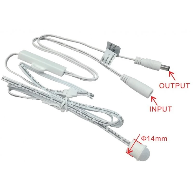 Motion sensor switch for 12-24V systems, with a 40-second interval, 2.1/5.5 connectors, and a 1m cable.