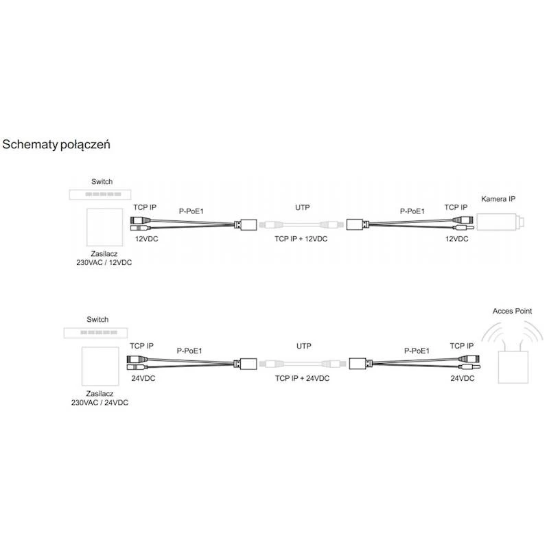 The set includes two passive PoE adapters, each equipped with an RJ45 port and a DC power connector. One adapter has a male DC plug, the other a female DC plug, making the connection of network devices quick and easy.