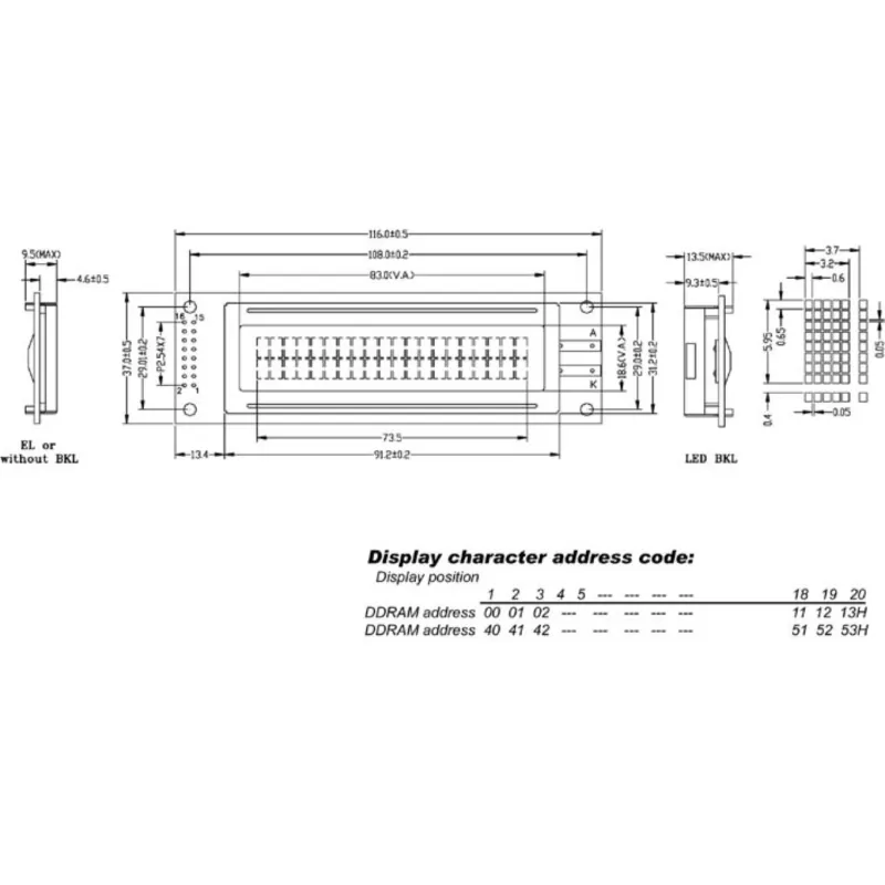 LCD 20 x 2 display with yellow backlight (BOTTOM VIEW TRANSFLECTIVE)