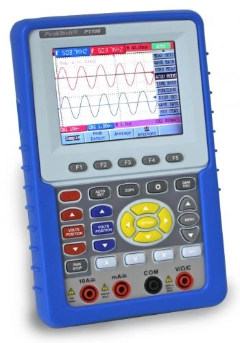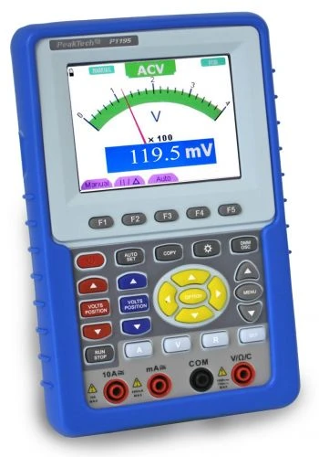 The **PeakTech 1195** is a combination of a **digital storage oscilloscope** with two channels via BNC sockets and **100 MHz bandwidth** and a digital multimeter with 4mm safety sockets for measurements of direct and alternating voltage, direct and alternating current, capacitance and resistance. The display of the multimeter shows **4000 digital digits** and has an additionally simulated analog scale with pointer, which switches automatically depending on the measuring function and range.