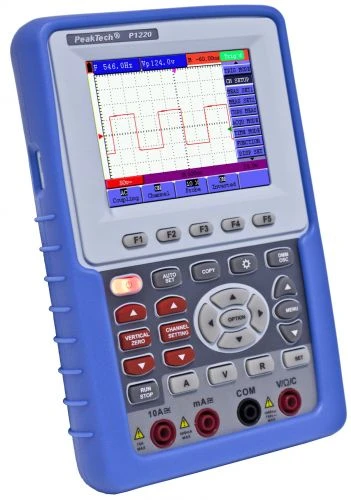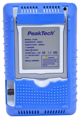 The **PeakTech 1220** is a combination out of a digital storage **oscilloscope** with one channel via BNC socket and **20 MHz** bandwidth and a digital **multimeter** with 4mm safety sockets for measurements of direct and alternating voltage, direct and alternating current, capacitance and resistance.