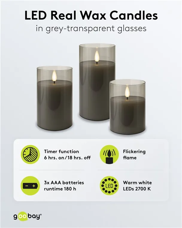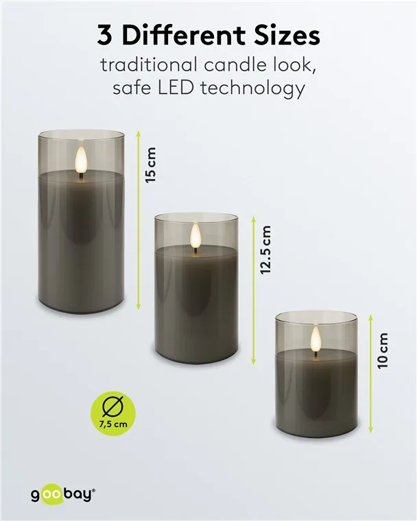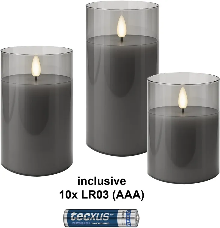 Set of 3 LED Real Wax Candles in Glass, Grey-Transparent, incl. 10x AAA (LR03)