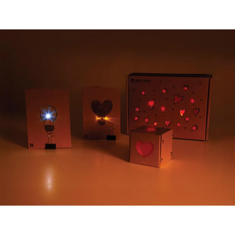 Get crafty with adhesive electronics! Combine easy electronics with creative cardboard crafting thanks to this all-inclusive set. Inside the box, you will find everything that you need to make [b]4 projects[/b], plus some extra electronic components to create your own ideas! To make each project, you will need to connect the electronic components by using adhesive copper tape. You read that right, [b]soldering is optional![/b] You can choose to either tape or solder the components to create a connection. The components include a battery, a resistor and one or more LEDs in various colours. The manual is illustrated with pictures and a simple explanation in 5 languages. The only extra tools you need are scissors, pliers and some glue. Below is a description of each project, starting with the easiest one. We recommend that you start off by making the easiest project first so you can gradually grow as a maker. The first two projects (A & B) are lovable cards with LEDs that will light up once finished. The perfect gift for a special friend or family member is a DIY gift like these cards! The third project (C) is a nifty little cube that holds 3 RGB LEDs. These LEDs will shine different colours in multiple effects. Fold and pin the cube together et voila! Lastly, you can convert the Whadda box into a lightbox by cutting your own unique design in the lid. Add the electronics and [b]enjoy your own creation.[/b]