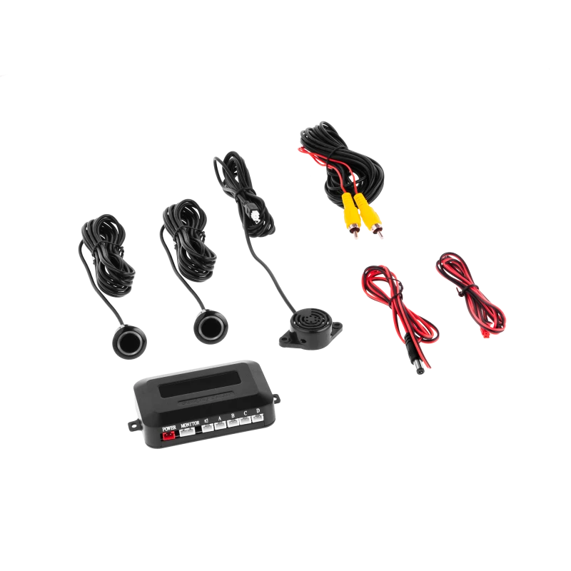 Included: camera in license plate frame with two sensors, control unit, 2x AV cable, 2x power cable, buzzer, user manual