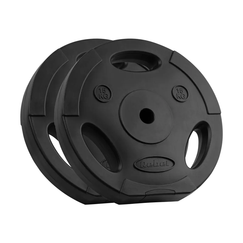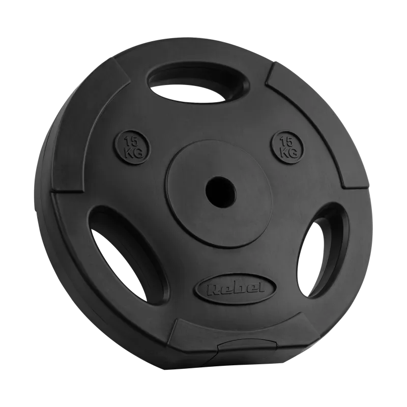 3 profiled handles Rebel Active bitumen weights have three properly profiled handles that allow you to perform a variety of strength exercises without the need for additional equipment. Thanks to them, you can use the weights as dumbbells for squats, lunges, deadlifts or overhead presses. They also facilitate quick weight changes on barbells. Ergonomic handles minimize the risk of injury, providing a secure grip even during the most demanding exercises. Freedom of choice The Rebel Active set allows you to train raises and squats using the weights themselves. You can also put the weights on a barbell. The standard hole diameter of each weight of 31 mm makes them compatible with most popular barbells.