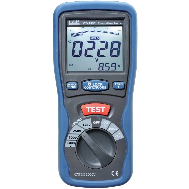 Insulation TesterWhen doing power installation it can provide 125V,250V, 500V and 1000V . It can supply more 1mA current to feed the capacitance load. With the auto-range function, it can measure up to 4000 MegaOhm with the resolution of 1Kohm.Auto-discharge of capacitive voltageLive circuit detection prevents insulation test if voltage >30V is detected Min/Max recording & Data Hold1mA test current for MegOhm range at rated voltage200mA short current for continuity range