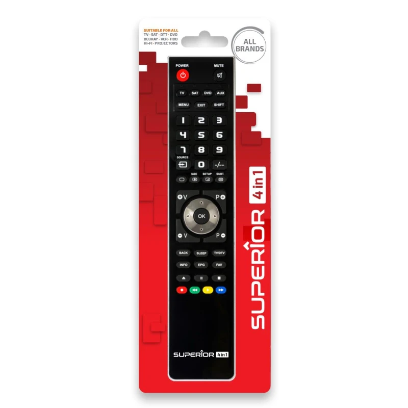 The Superior 4in1 Perform (SUPTPB012) is a professional universal remote control designed to manage up to four audio and video devices simultaneously. Part of the Perform series, it features an ergonomic design and offers a streamlined setup process via PC.