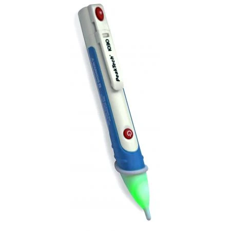 Voltage Indication: If AC-voltage is at the measuring point, it is visually indicated by a flashing red LED and the integrated buzzer sounds. The probe lights green when the measuring point is free of voltage.