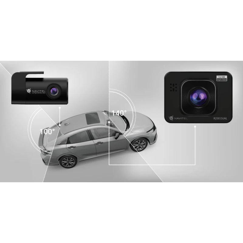 On NAVITEL R250 DUAL there is the GC2053 (night vision) matrix and the glass lenses and a wide viewing angle of 140°, which provides a high-quality recording of everything that happens on the road.