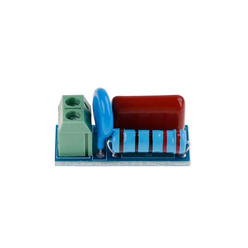 The OKY3485 RC filter module is a snubber circuit designed to protect relay contacts and thyristors from damaging voltage spikes. It effectively absorbs the back-EMF generated when switching inductive loads, enhancing circuit reliability and component lifespan.