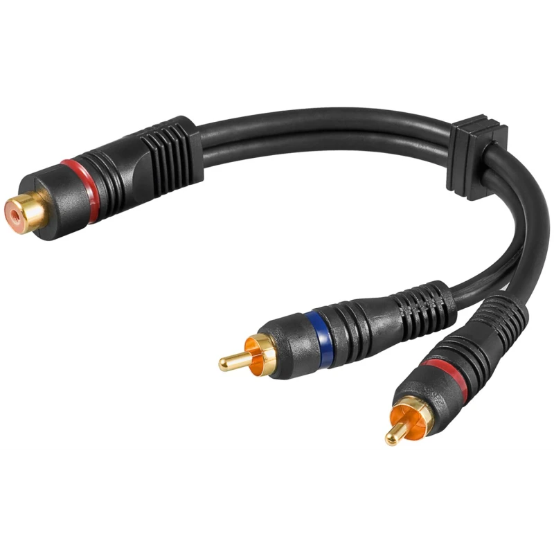 This adapter features one RCA female connector and two RCA male connectors, with a length of 0.2 meters. It is double-shielded for optimal signal integrity.
