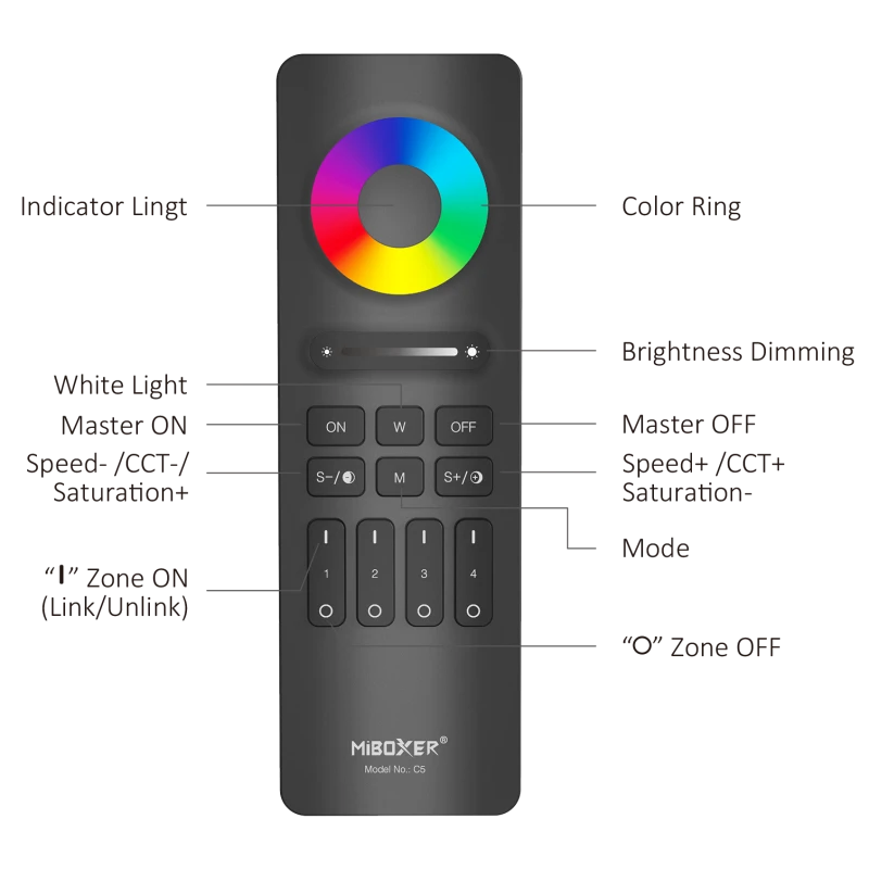 The C5 4-Zone RGB+CCT Remote is a sophisticated lighting control solution designed for those who value both style and functionality. Utilizing advanced 2.4G RF wireless transmission technology, this remote offers a stable and responsive connection with a control distance of up to 30 meters. It is fully compatible with the MiBoxer and Mi-Light 2.4G series, allowing you to manage your entire lighting ecosystem from a single device.