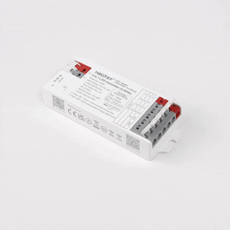 The E3 series controllers are designed to control 3-5 colour systems which are 12/24V. Up to 6A current per channel (colour) is allowed, 12A shared. This RF controller can accept signals from MiBoxer 2.4GHz remotes and gateways. The mode can be changed between 3/4/5 colour via the button located on the topside of the device.