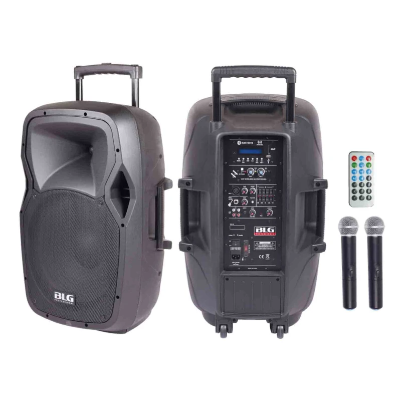 Portable audio system with 2x UHF wireless microphones operating at different frequencies, remote control and integrated USB/SD/BT/FM playback connectors. All this in one system works through a network 220V or 12V an internal battery.