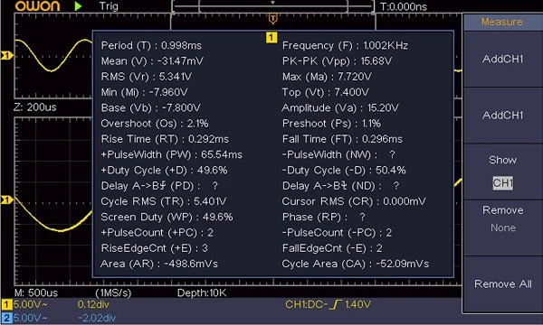 Automatic Measurement: Vpp, Vavg, RMS, Frequency, Period, Vmax, Vmin, Vtop, Vbase, Width, Overshoot, Pre-shoot, Rise time, Fall time, +Width, -Width, +Duty, -Duty, Delay A→B, Delay A→B, area, cycle area