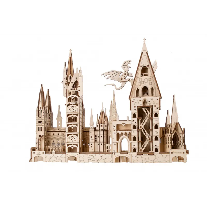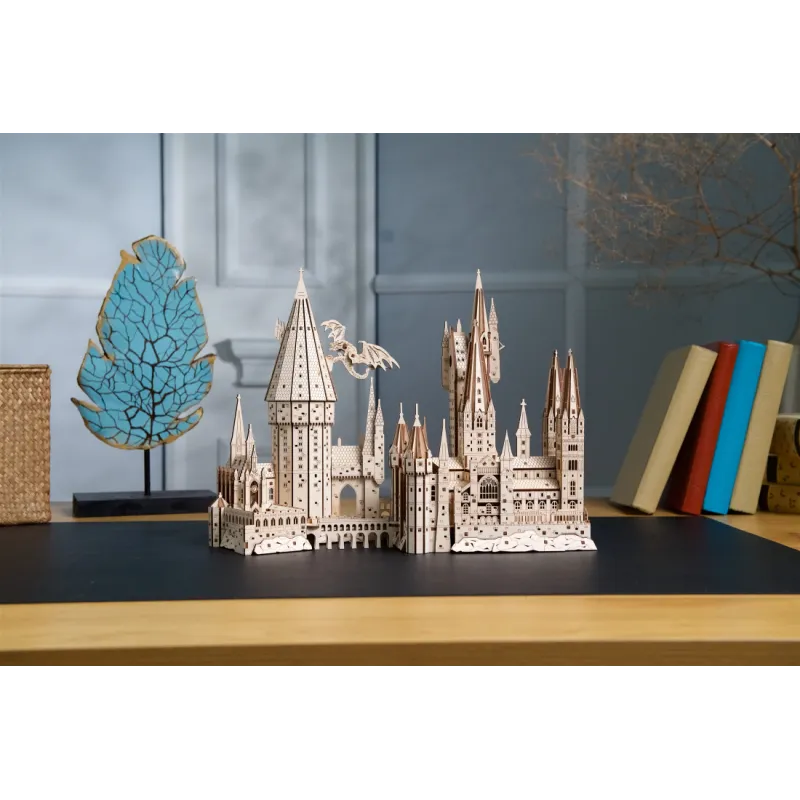 The front of the model features detailed Hogwarts School of Witchcraft and Wizardry buildings, towers, parapets and railings, including trim, cloisters, cut-out windows and laser engraving to mimic the look of stone, stonework and slates on roofs. . The back of the model has been cut to be more compact, allowing it to be placed against a wall, and reveals the hidden interior of the castle, including the Great Hall, tower staircase, rooms and courtyards. A dragon with movable wings hangs from the main tower, reminiscent of the scene from Harry Potter and the Goblet of Fire, where Harry is chased by a fire-breathing dragon.