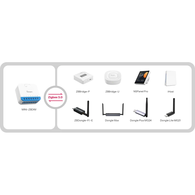 The SONOFF MINI-ZBDIM is an ultra-compact Zigbee 3.0 smart dimmer switch designed for concealed installation behind existing wall switches. This module enables smart lighting automation and dimming capabilities without requiring the replacement of original hardware.