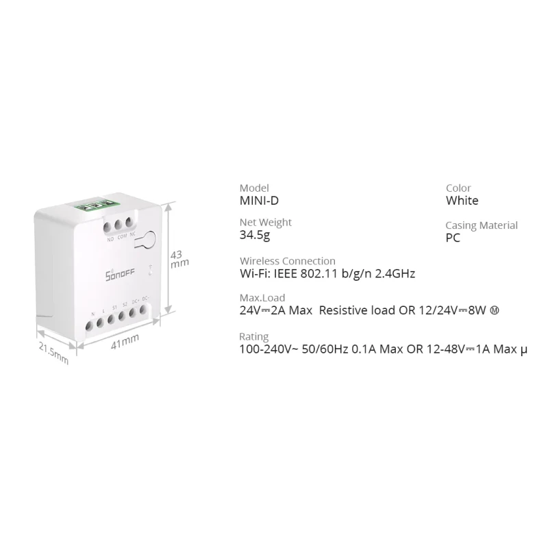 Sonoff MINI-D is a compact and versatile Wi-Fi smart switch that supports the Matter standard and is designed to control various home electronics such as garage doors, heating systems, or water pumps. This product is designed to work with either an AC or DC power supply, but not both simultaneously.