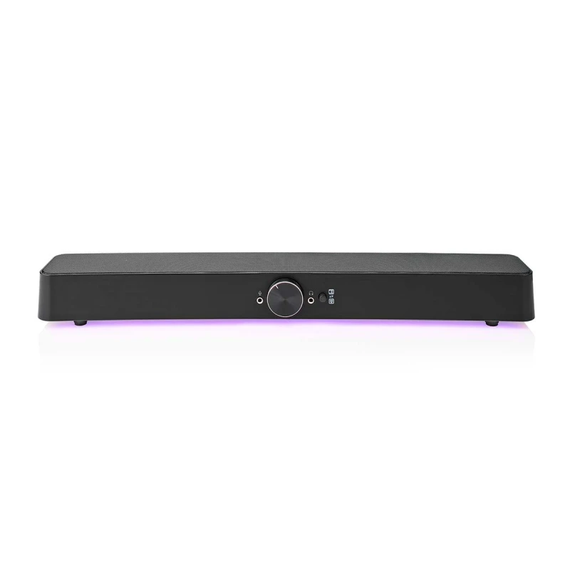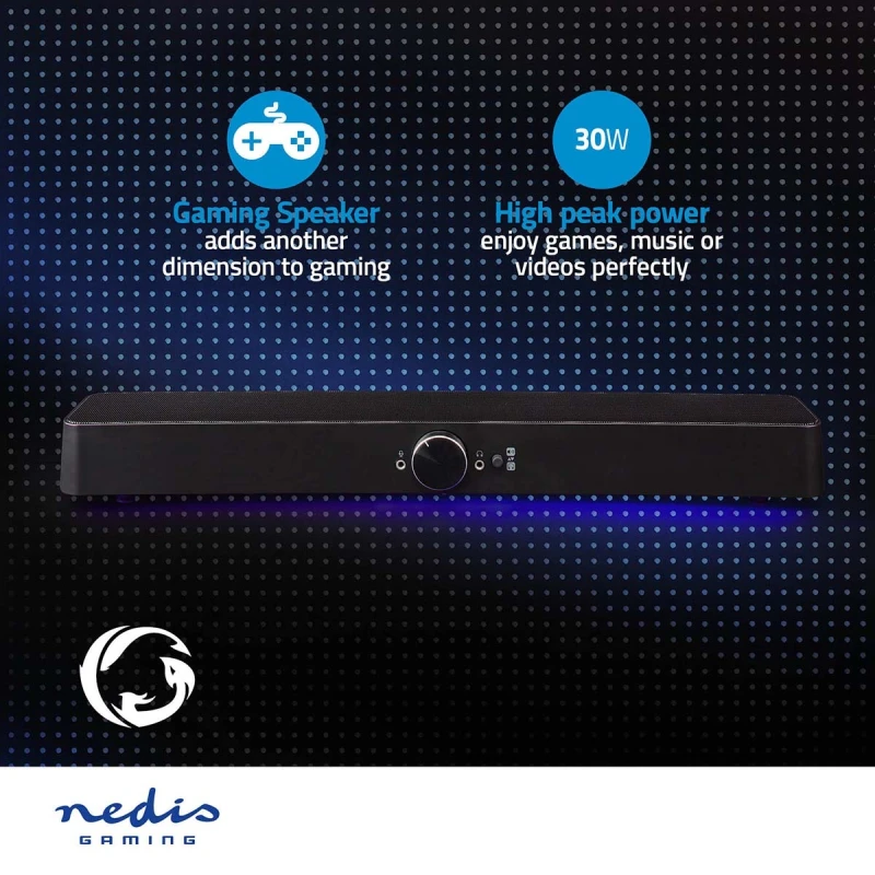 This Nedis soundbar gives an extra dimension to every gaming experience with its built-in multi-colour LED lighting. It easily fits underneath many different monitors and the Bluetooth® function enables listening to music through smartphone or tablet. With its maximum Wattage of 30W you can enjoy games, music or videos perfectly. The soundbar even has a pass-through function for your headset via 2x 3.5 mm jack.