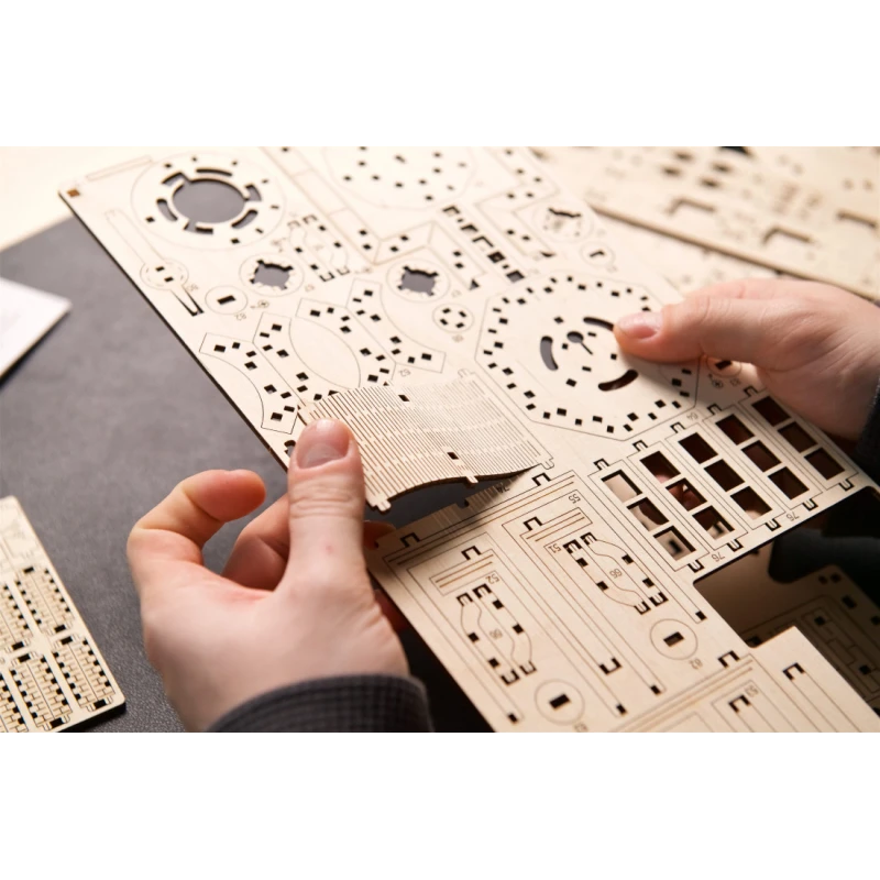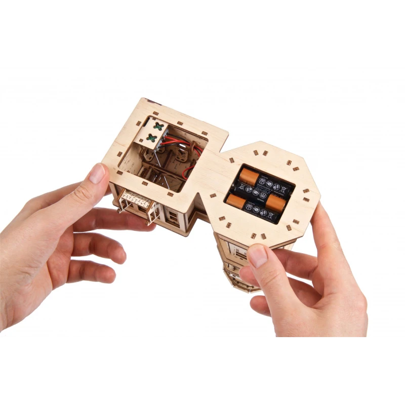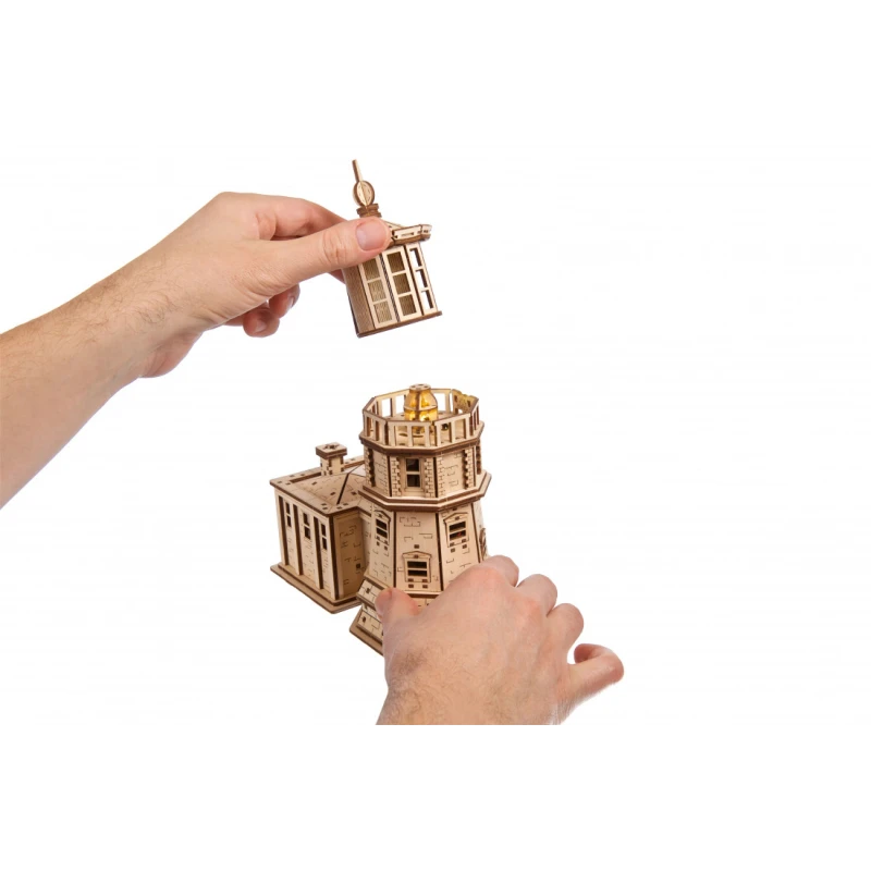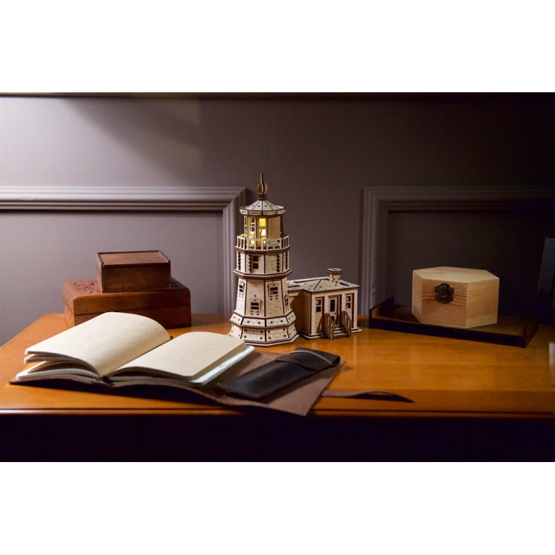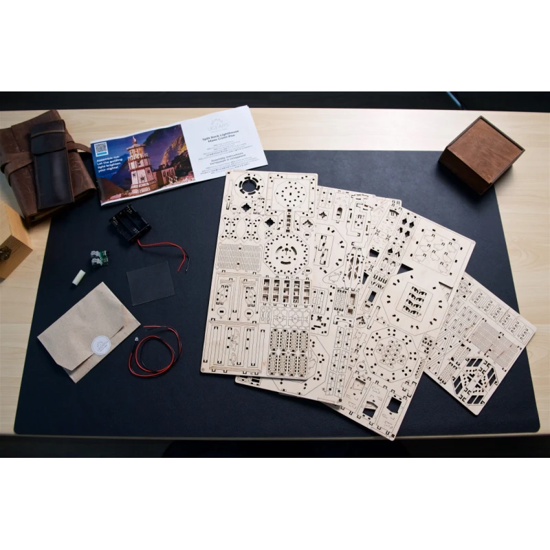 Made from high-quality 3mm composite wood, the model’s dimensions are 19.8 × 24 × 11.6 cm, the ideal size for a nightstand. The keeper’s house and tower have windows, along with a chimney and a staircase at the entrance. Laser engraving gives the exterior surfaces a realistic stone and brick appearance. The cupola can be removed from the tower by twisting it off, the keeper’s house door opens and shuts with a rubber band mechanism, and the curtains on the windows move when tilted.