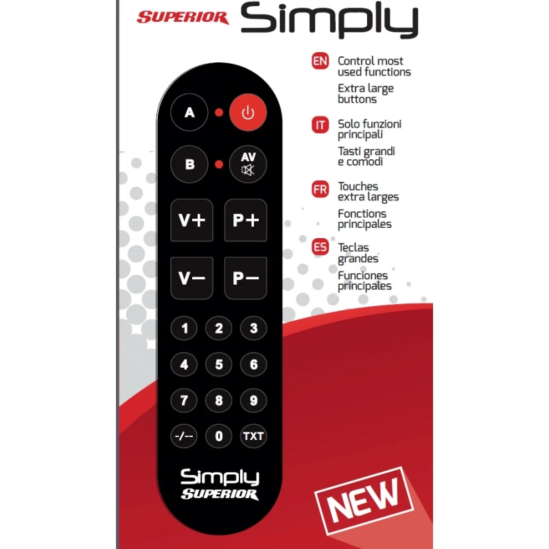 A simple remote control with 20 large buttons that learns commands from another remote. Thanks to its simplicity, it is ideal for older people and for TVs in tourist accommodation.