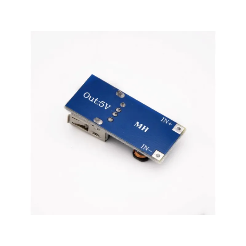 A compact DC/DC step-up converter with a USB-A connector, ideal for creating a power bank or for powering various projects like an Arduino or a mobile phone. This module is an excellent choice for any portable electronics requiring a stable 5V source from a low-voltage input.