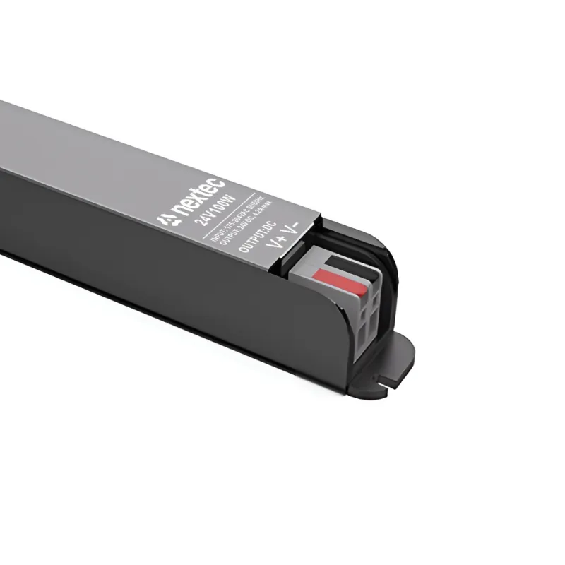 The Poltronic AURA series (PB046812) is a 100W modular LED power supply designed to deliver a stable 24V DC output for indoor lighting systems. Its ultra-slim construction and user-friendly connection mechanism make it a versatile choice for professional installations.