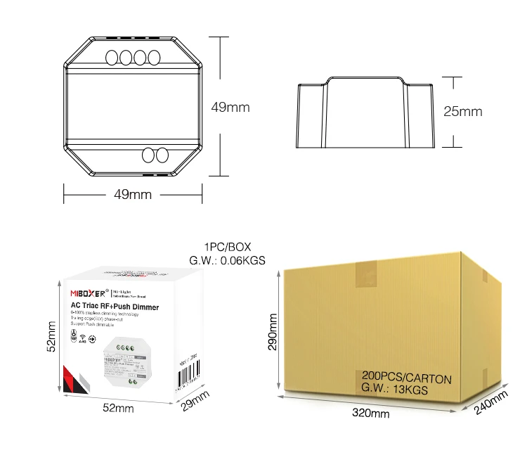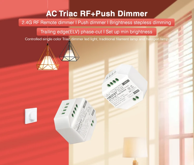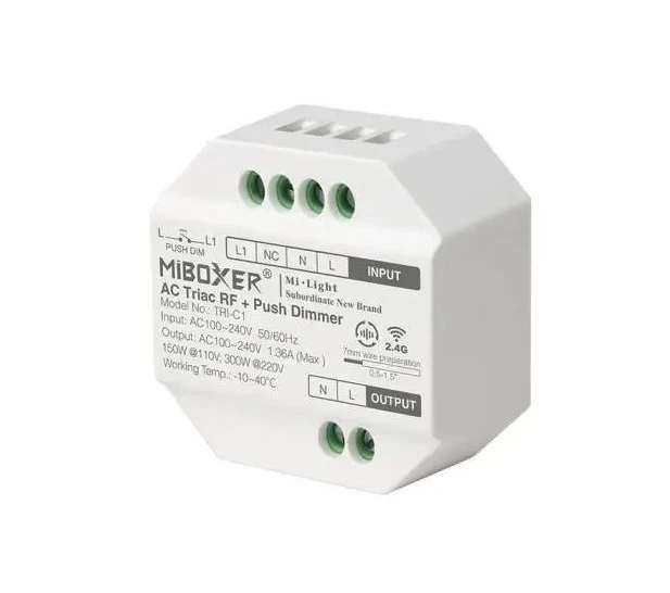 The MiBoxer TRI-C1 is a versatile AC Triac RF+Push Dimmer designed to bring modern smart control to traditional lighting systems. This compact module supports traditional incandescent lamps, halogen lamps, and triac dimmable LED lamps, offering a seamless upgrade for your home or commercial space.