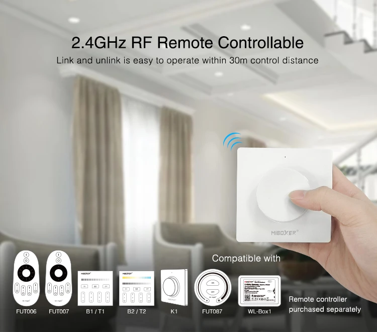 Equipped with advanced 2.4G wireless transmission technology, the TRI-C1 features 0~100% stepless dimming without any flickering, ensuring eye comfort and perfect ambiance. The device includes a unique auto-forwarding function, where the signal is relayed from one lamp to another, effectively making the remote control distance infinite for large-scale installations.