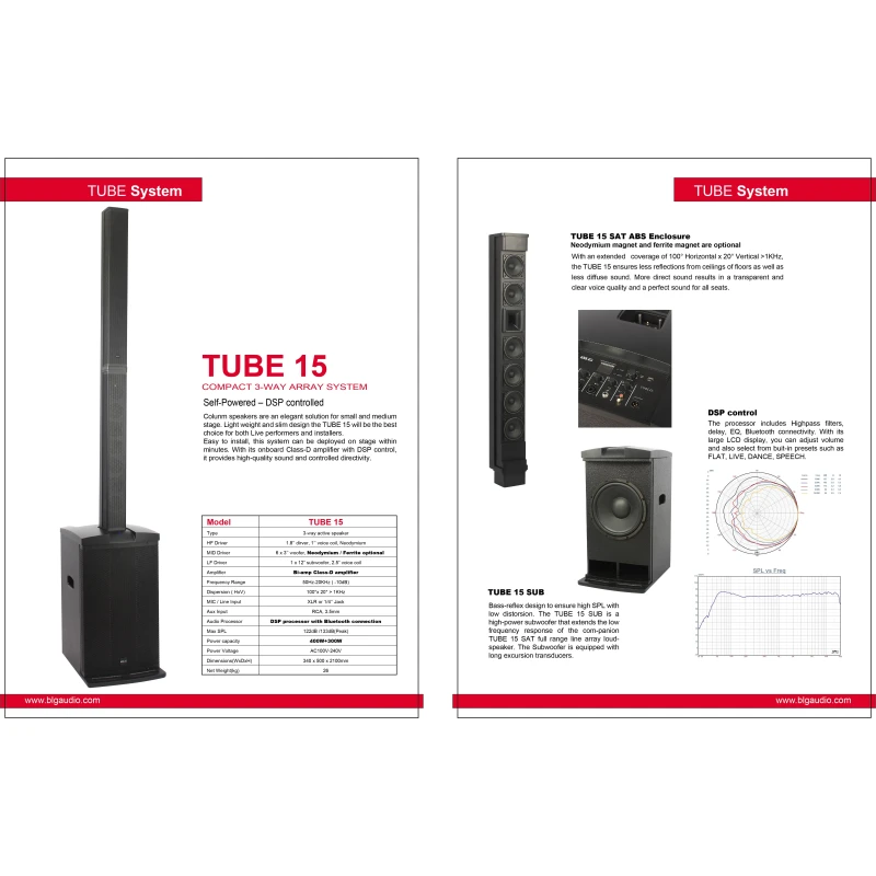 TUBE 15 Compact 3-way array system. Self-powered DSP controlled Column speakers are an elegant solution fo small and medium stage. Light weight and slim design the TUBE 15 will be the best choise for both Live performers and installers. Easy to install, this system can be deployed on stage within minutes. With its onboard Class-D amplifier with DSP control, it provides high-quality sound and controlled directivity.