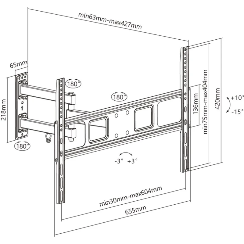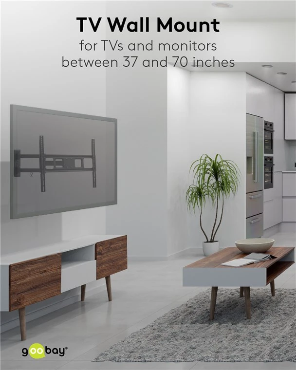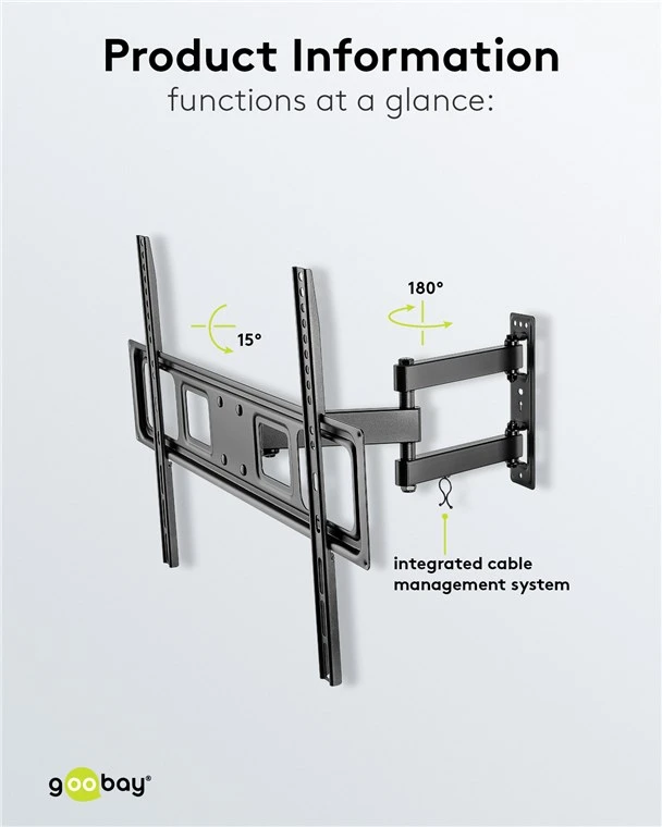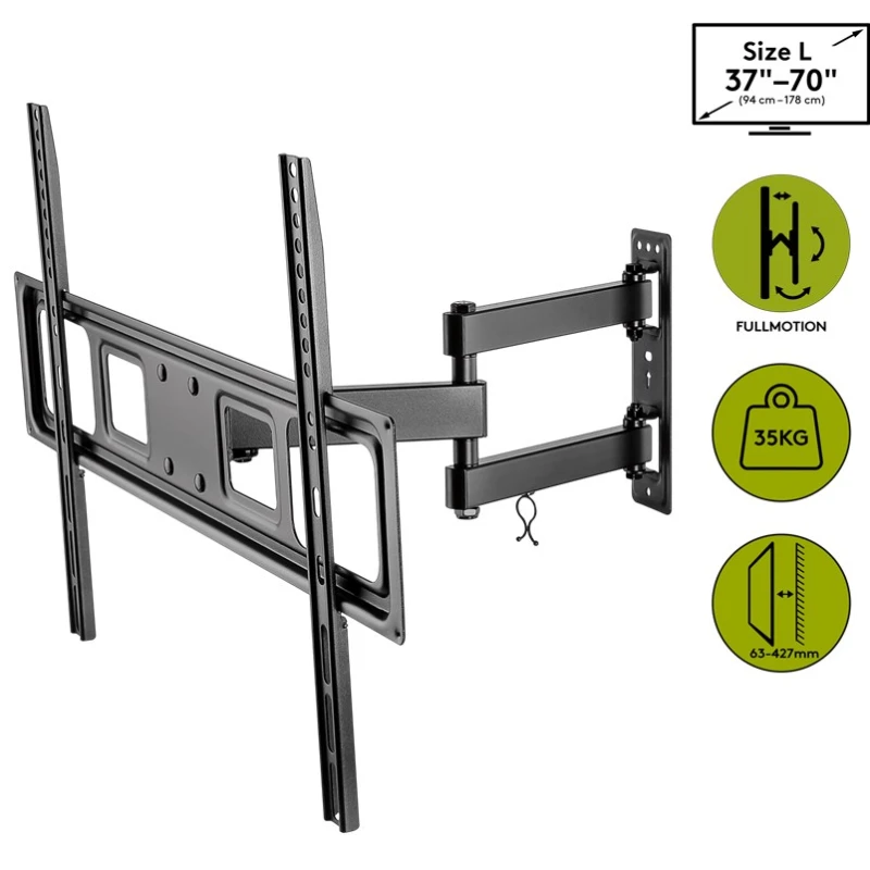 TV wall mount for most 37-70 inch (94-178 cm) TVs weighing up to 35 kg. Fully mobile, rotatable and tiltable, the bracket provides an optimal angle of inclination up to 427 mm away from the wall. Perfect viewing angle and maximum flexibility thanks to full mobility when tilting (up/down +10° to -15°) and turning (left/right by ±90°).
