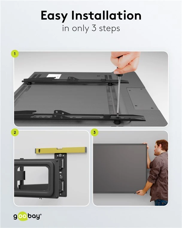 Easy to install and compatible with VESA standards 200x200, 300x300, 400x200, 400x400, 600x400.