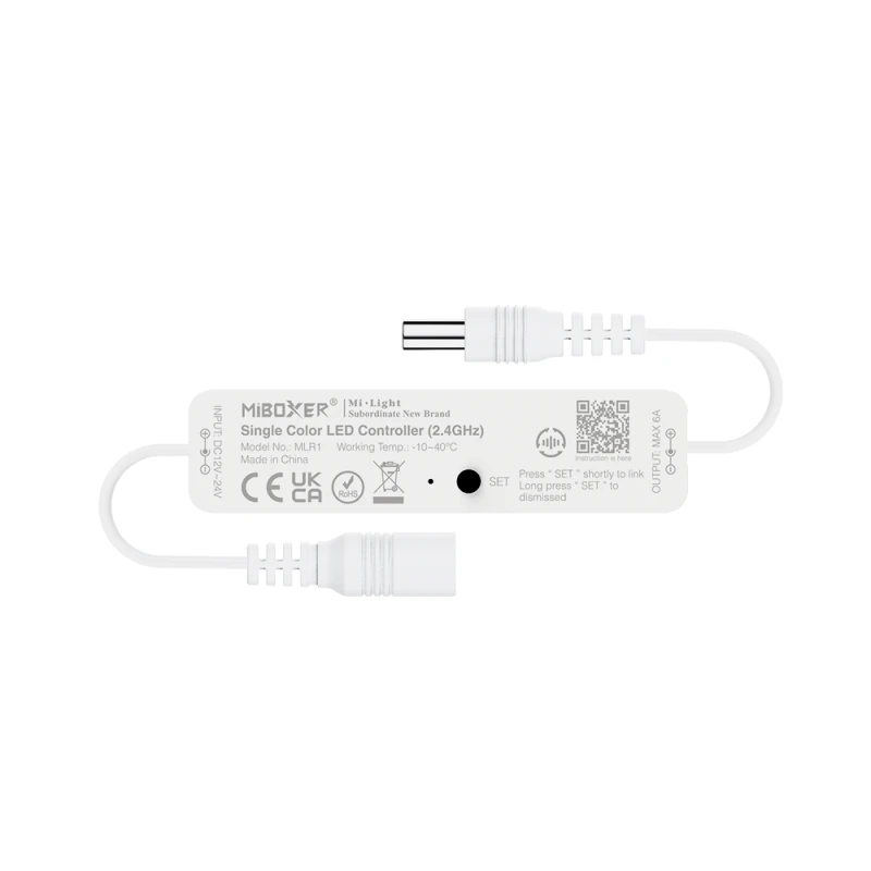 The MiBoxer MLR1-MINI is a compact, single-channel 2.4GHz controller designed for the precise management of single-color LED strips. Its ultra-small form factor and plug-and-play design make it an efficient solution for integrating dimming capabilities into various LED lighting setups.
