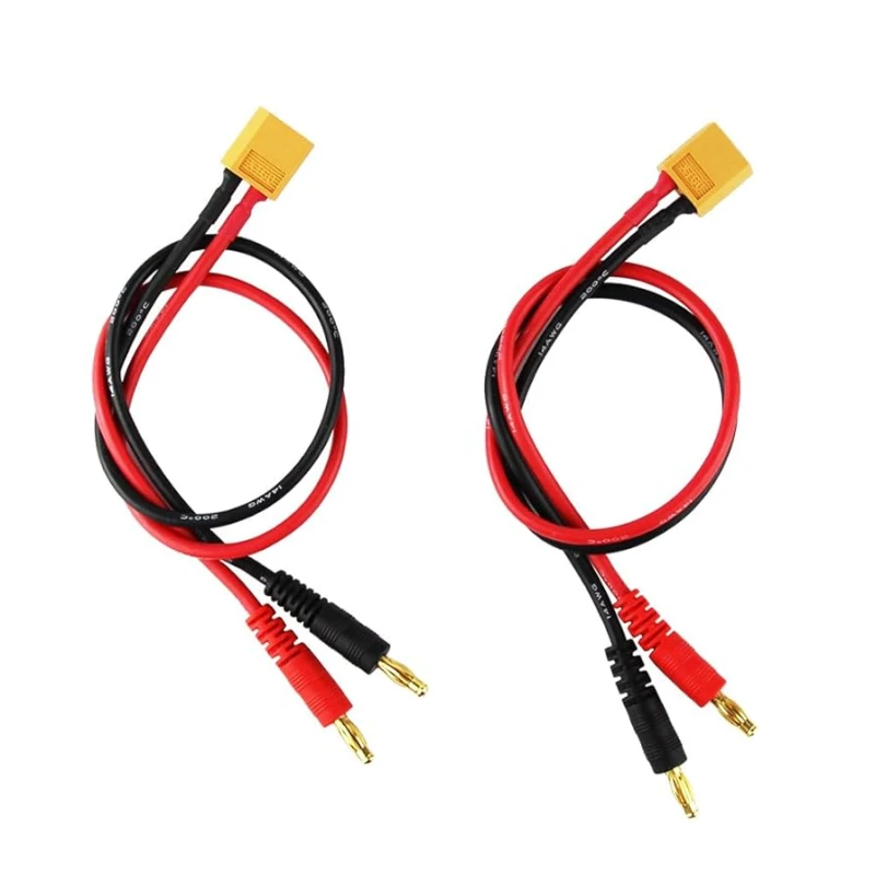 This is a convenient charging cable designed to connect battery chargers to devices with an XT60 connector. The cable features 4mm banana connectors on one end, compatible with most chargers, and an XT60 female connector on the other end.