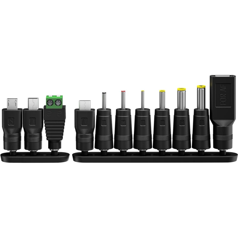 Included Adapters: 2.5/0.7 mm, 3.5/1.35 mm, 3.0/1.1 mm, 4.8/1.7 mm, 4.0/1.7 mm, 5.5/2.1 mm, 5.5/2.5 mm, screw terminal, USB A socket, USB C plug, Micro-USB plug, Mini-USB plug
