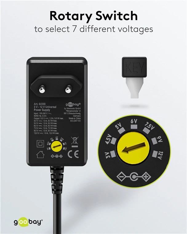 Output Voltage: 3 V - 12 V DC (adjustable, 7 steps)