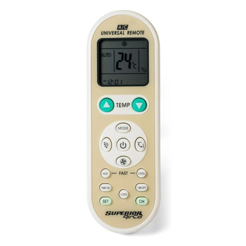 The SUPERIOR AirCo Universal Remote Control is a versatile remote control that is compatible with all popular air conditioning devices. With two programming modes (manual and automatic), the SUPERIOR AirCo Universal Remote Control is easy to set up and use.The layout and buttons are intuitive and easy to understand. Its ON/OFF programmable function automatically turns the air conditioner on or off at the pre-set times. In addition, the dedicated buttons for heating (“Fast Hot” 27° C) and cooling (“Fast Cool” 21° C) can be used to adjust the temperature quickly.