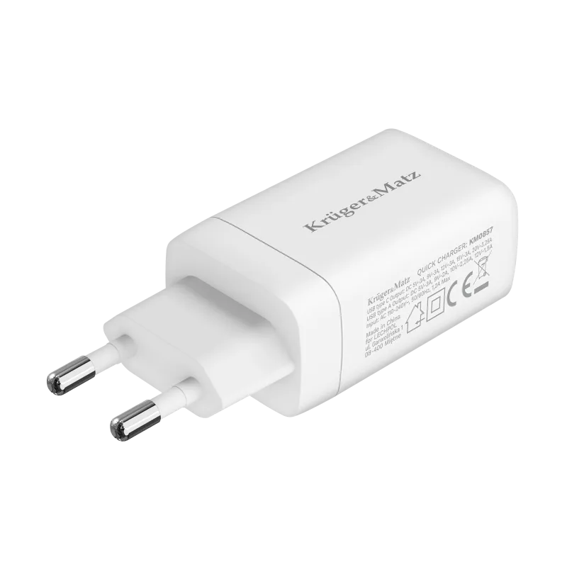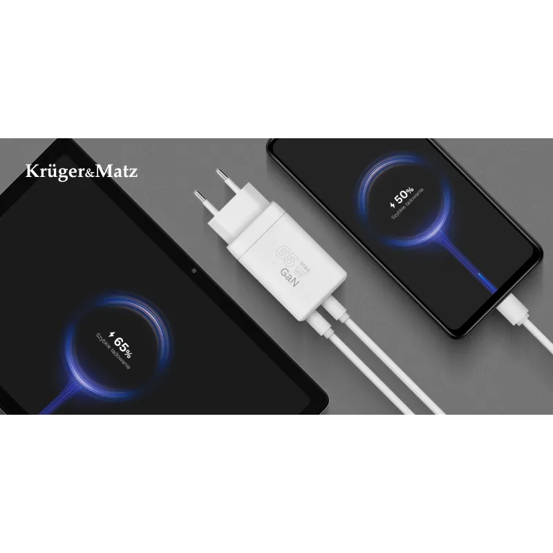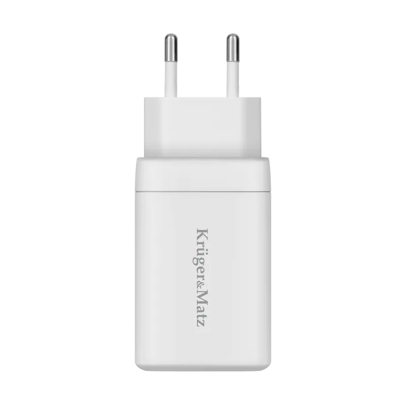 The Kruger&Matz KM0857 is a 65W wall charger utilizing GaN (Gallium Nitride) technology to provide high-efficiency power delivery in a compact size. This dual-port charger is designed to support a variety of devices, including smartphones, tablets, and laptops.
