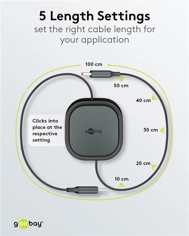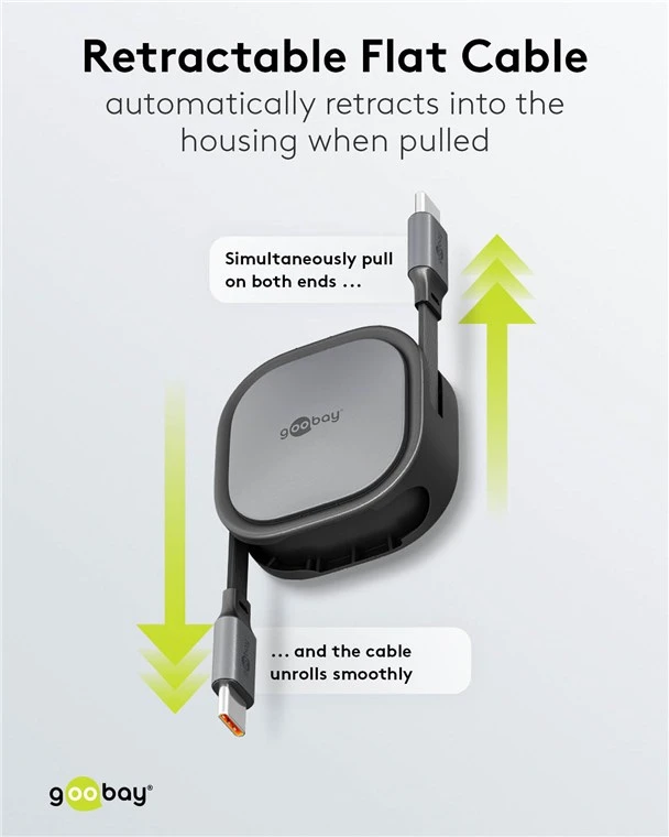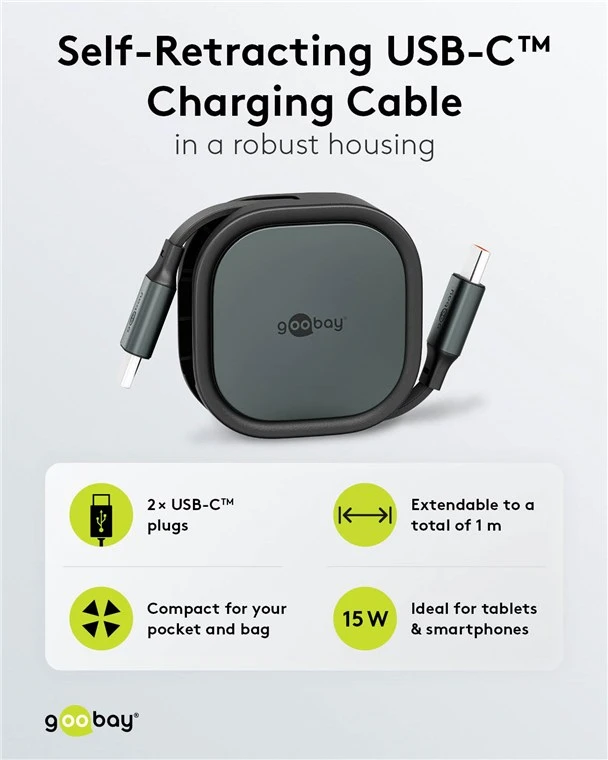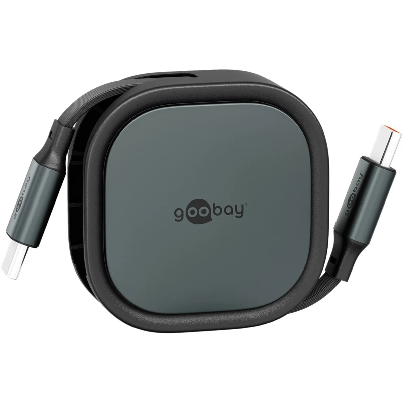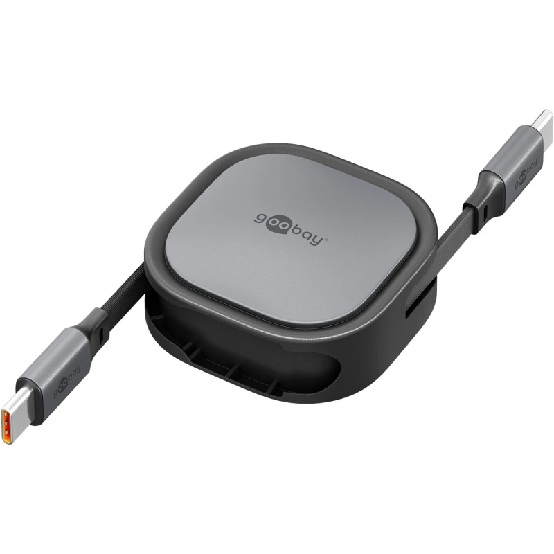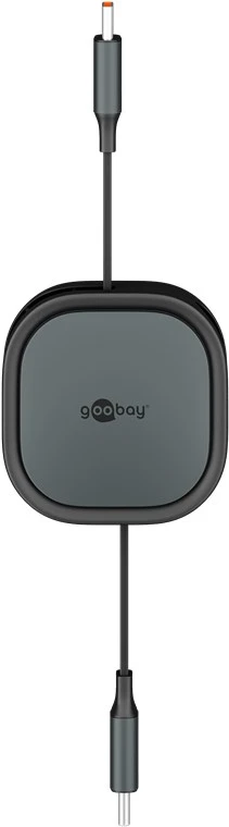 This compact, self-winding USB-C to USB-C cable (1 meter, black/silver) is designed for efficient charging and data synchronization of small devices. Featuring an automatic retraction mechanism, the cable remains tangle-free and protected within its durable housing, making it ideal for travel and mobile use.