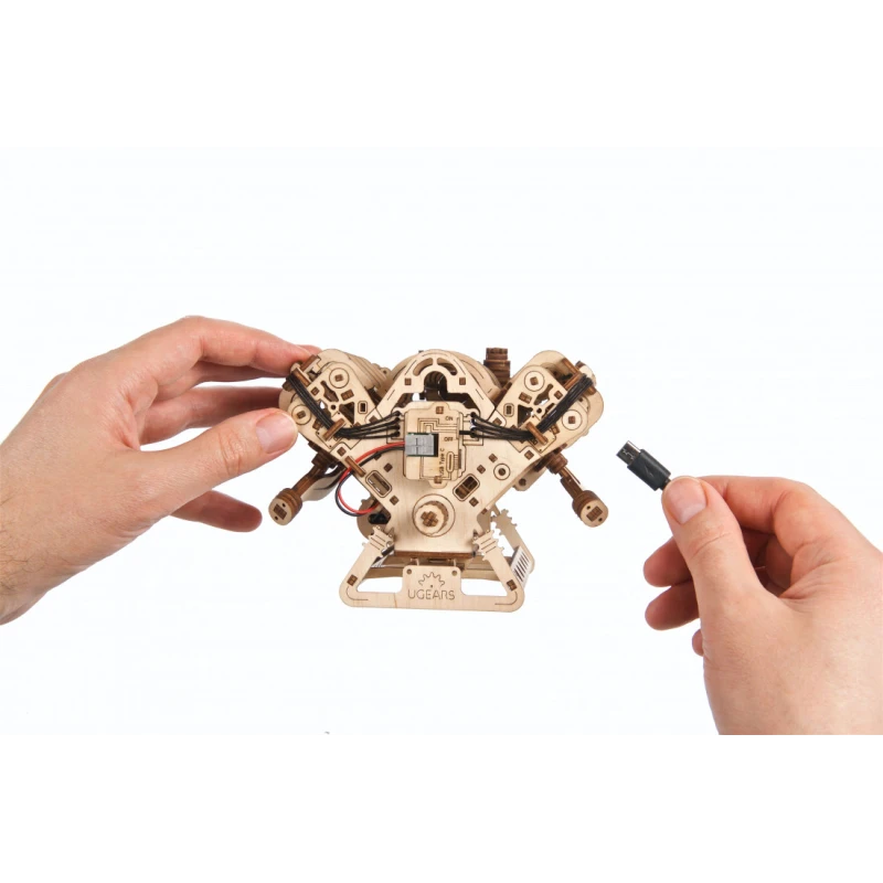 The model includes all the main mechanisms found in a real V8 engine – eight cylinders with pistons moving in cycles, 16 spring-loaded valves, a timing chain, throttle valve, and much more. The model can be powered by an electric motor or by turning a knob to watch the engine mechanisms come to life. Connect the model to a power source using a USB-C cable.