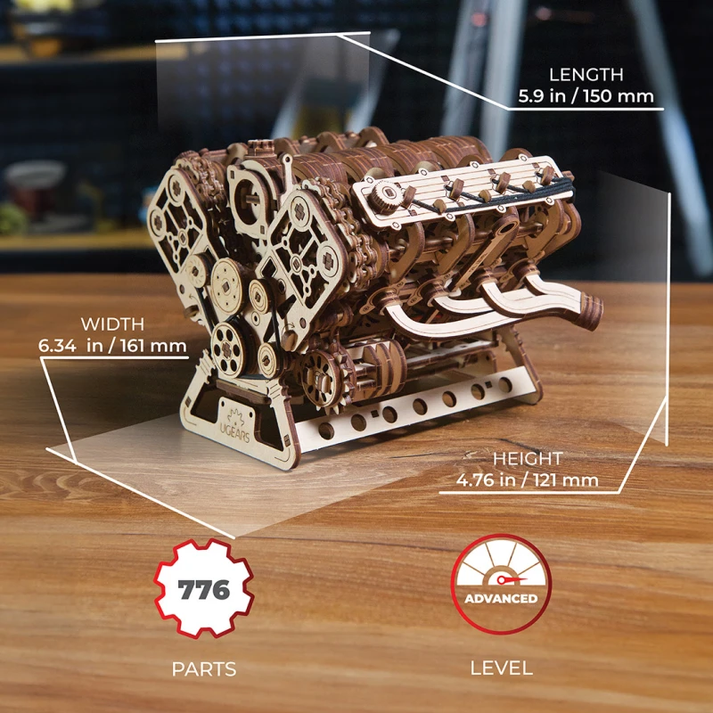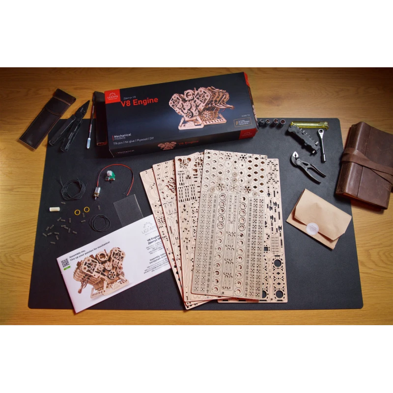 Assembling the V8 engine allows you to thoroughly understand how an internal combustion engine works, while also offering a fun crafting experience. The model consists of 776 parts, with 25 spare parts included. All parts are made from high-quality composite wood and laser-cut. The model can be assembled without glue or special tools—simply follow the step-by-step instructions.