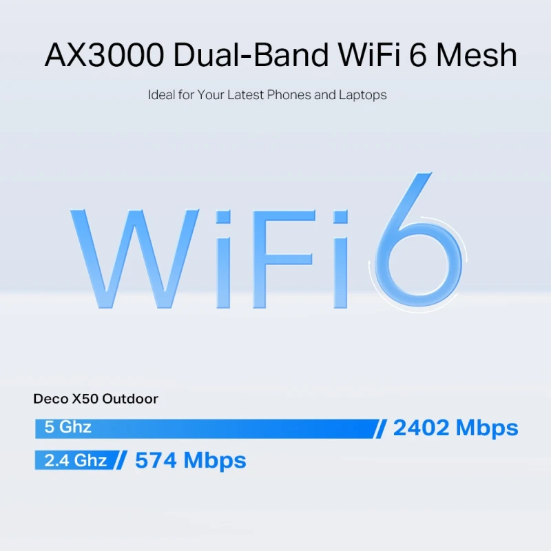 TP-Link Deco X50-Outdoor is a dual-band AX3000 Mesh Wi-Fi 6 router engineered to extend high-performance wireless coverage to outdoor spaces.