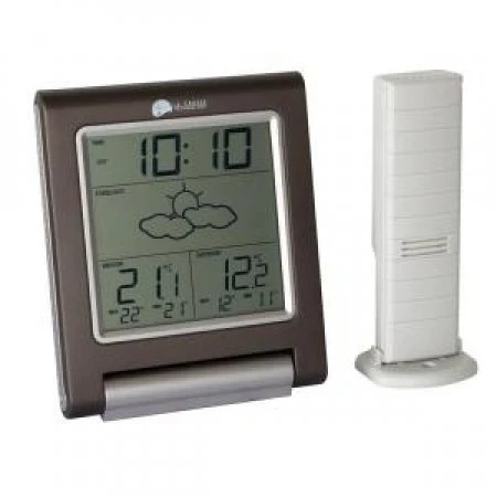 This universal wireless weather station, La Crosse WS9135, provides information on indoor and outdoor temperatures as well as expected weather conditions.