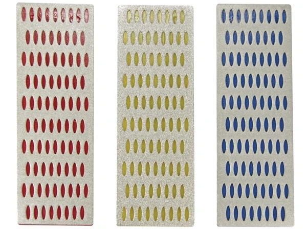 Keep knives and tools sharp and ready for use with this 3-piece diamond sharpening stone set. This set is specifically designed for anyone who values razor-sharp cutting edges. The set includes three stones: a fine (#400 grit) for refining the edge, a medium (#300 grit) for general sharpening, and a coarse (#150 grit) for restoring dull edges. The color-coded stones (blue, red, and yellow) make it easy to select the right grit for your sharpening needs. With a convenient size of 154 x 52 mm, these stones are perfect for both home and professional use. + Quality: Made from high-quality diamond material for effective sharpening.