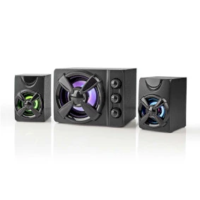This powerful and fashionable Nedis sound set consists of a 2.1 system, with 2 satellite speakers and a subwoofer. The individual equalizer knobs lets you adjust treble, bass or volume easily. The built-in multi-colour LED lights will lighten up every room.