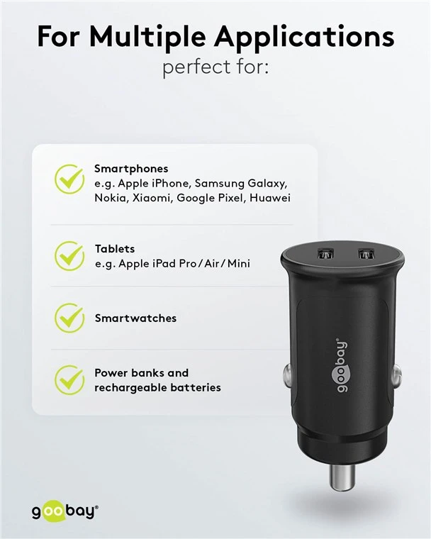 Compatible with smartphones like Apple iPhone, Samsung Galaxy, Nokia, Xiaomi, Google Pixel, LG, Huawei, Blackberry, tablets like Apple iPad Pro / Air / Mini, power banks and external batteries