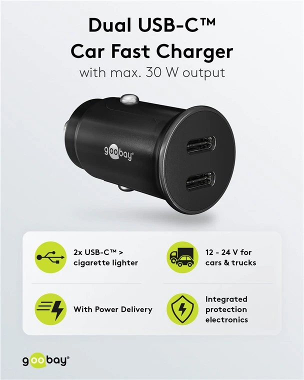 The charger in mini format charges two devices simultaneously on the cigarette lighter via USB-C™.