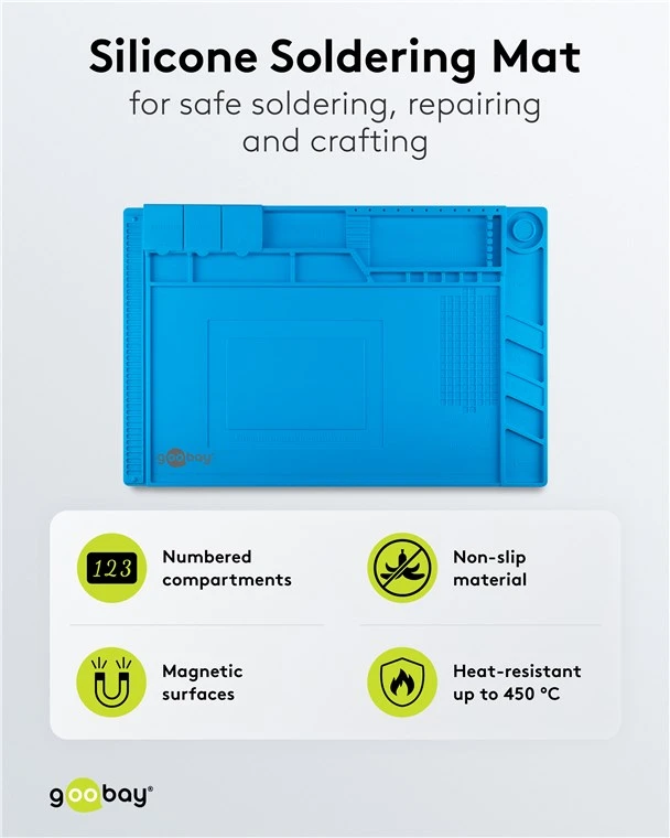 The odourless solder mat is heat-resistant up to 450 °C, allowing you to place the heated soldering iron on it without damaging the work table.